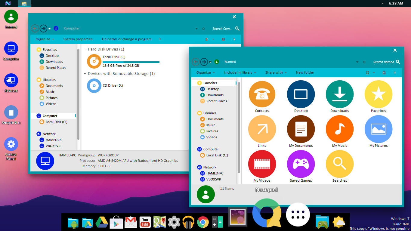 Buat kamu yang bosen dengan tampilan windows yang itu-itu aja, pengen menggantinya seperti android n atau android v7.0 nah gampang sekali, kamu hanya tinggal medownload android n skinpack ini kemudian menginstallnya. Berikut contoh tampilannya:)